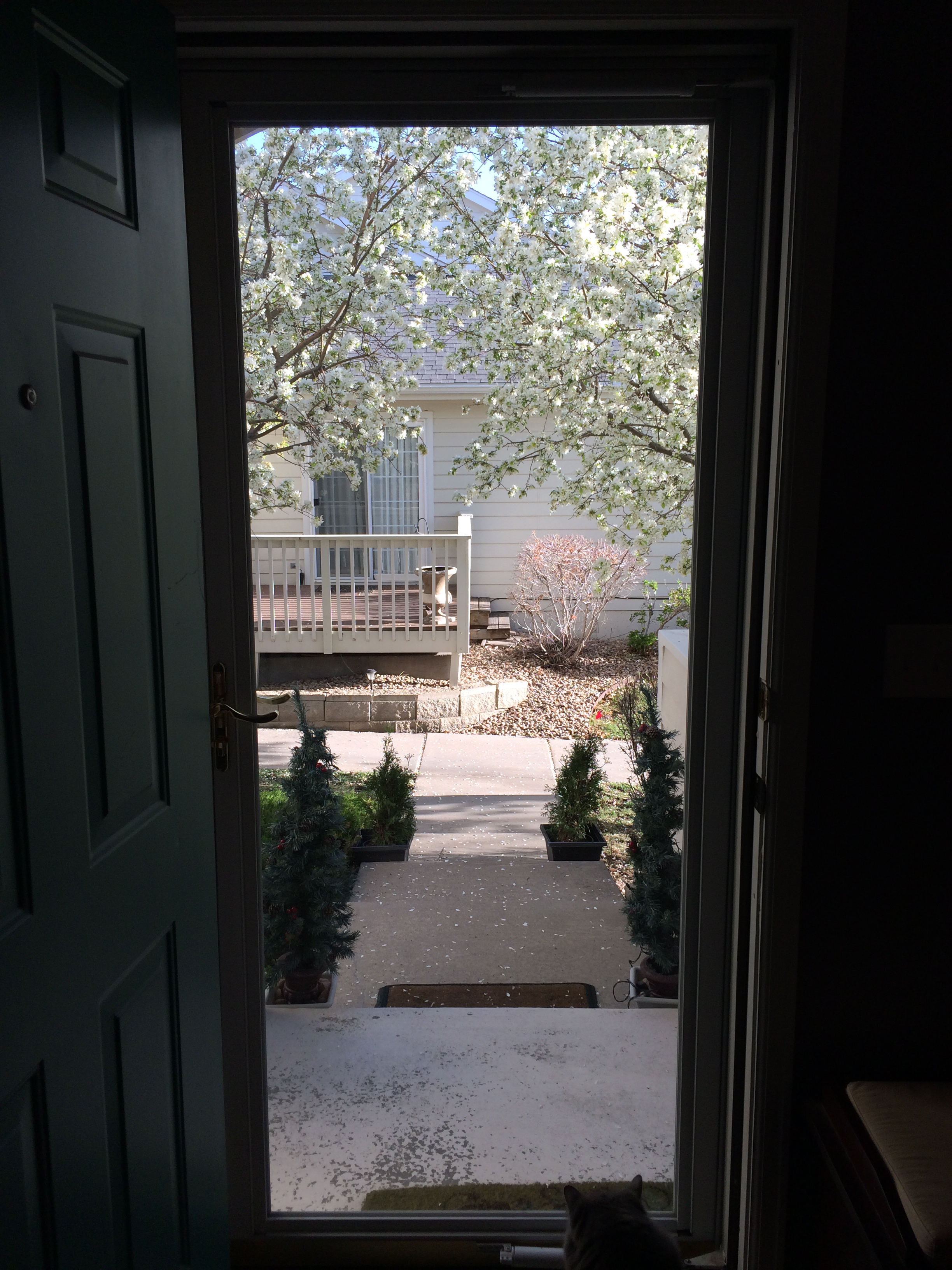 It’s April 23rd and spring is in the air. It’s also outside every single window in our house. What I mean is that we have two big trees outside our windows and they are in full bloom. They don’t produce any fruit but about every other year they flower like crazy. Here are some pictures looking out our windows (don’t forget you can click on an image to make it bigger!).